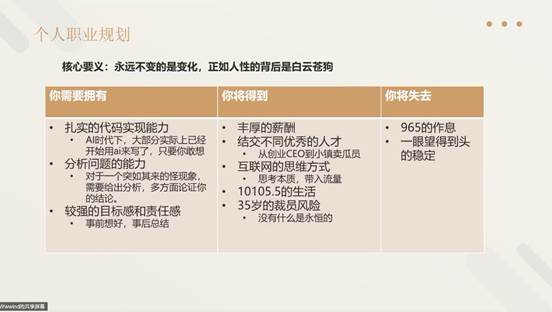 同时,他结合近年行业动态,重点分享了AI背景下算法岗位的需求变化与职业发展趋势:在大模型、AI agent技术快速发展的当下,互联网行业的就业面正向车企、机器人厂、国企等领域拓展,企业对人才的信息检索能力、信息分辨能力和强执行力提出了更高要求,AI agent等工具更是成为提升个人生产力的关键,能让从业者的成长效率实现倍数级提升;同时提醒同学们,职业规划需兼顾技术深度与行业视野,即便选择稳健型企业,也应尽量向AI领域靠拢,避免因行业变革陷入职业发展的瓶颈。之后,学长还分享了算法岗位的需求变化与发展动向,建议同学们在深耕专业技术的同时,扩宽行业视野,并保持持续学习的动力和能力。
