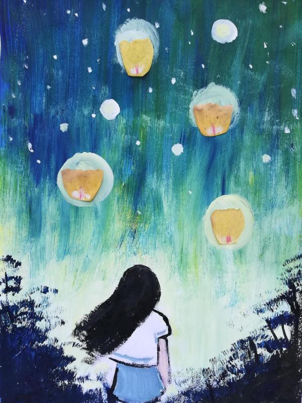 A girl watches sky lanterns